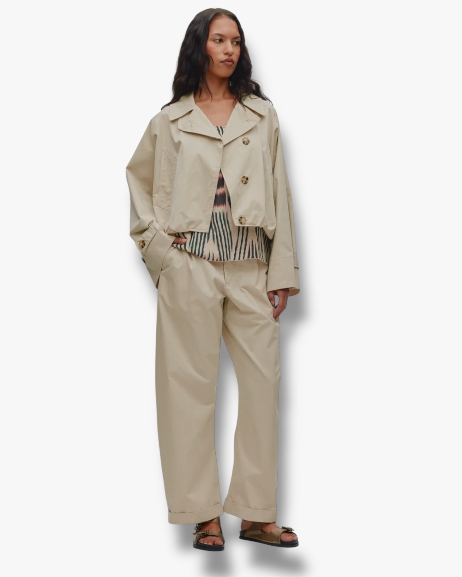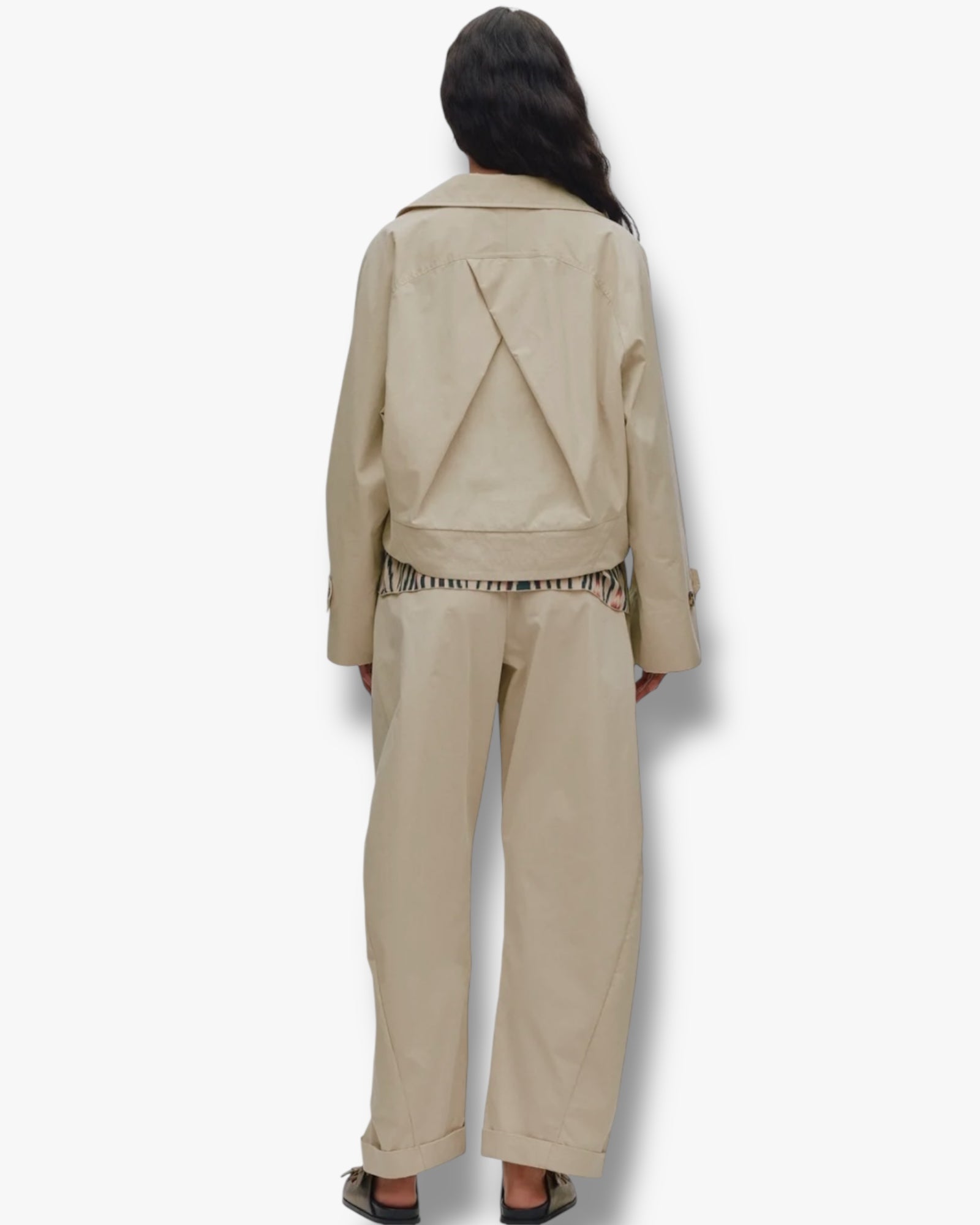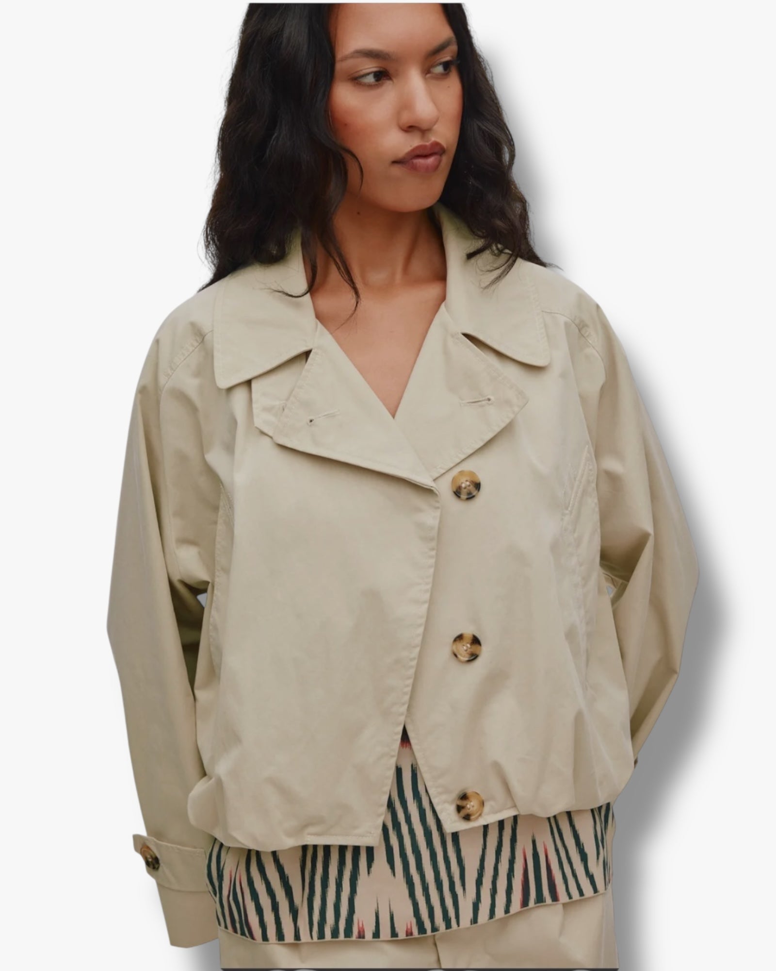 Rabens Saloner, Tilla korte jasje wordt gekenmerkt door een klassieke en tijdloze uitstraling. Het jasje heeft een korte, ontspannen silhouet en is afgewerkt met lange mouwen met lichte wijdte die kunnen worden dichtgeknoopt, een schuine sluiting en voorzakken, een klassieke kraag en een mooi rugdetail dat het ontwerp een stoer accent geeft.